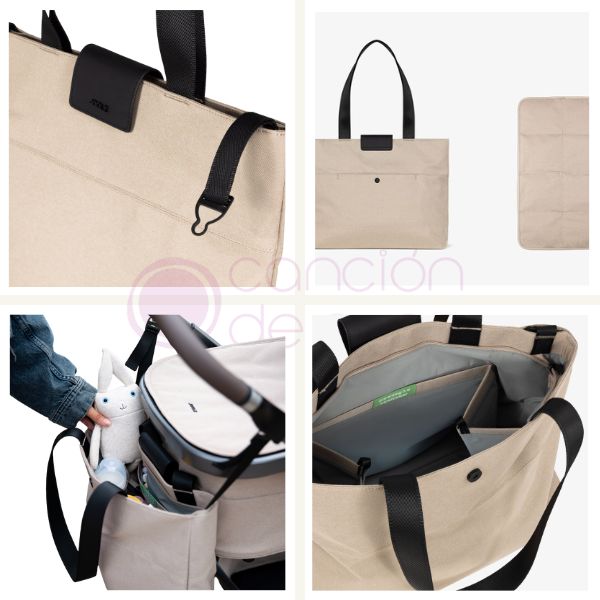 Su tejido exterior procede de botellas de plástico recicladas, lo que lo convierte en una alternativa responsable sin renunciar al estilo. La estructura incluye una apertura amplia y cómoda, bolsillos exteriores para botellas, un forro repelente al agua y un cambiador plegable incluido, para atender cualquier urgencia fuera de casa.