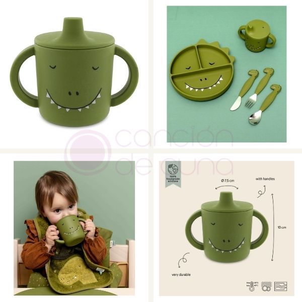 La taza de silicona Mr. Dino con asas Trixie es perfecta para ayudar a los peques en la transición hacia beber en vaso abierto. Gracias a sus asas grandes y ergonómicas, resulta fácil de sujetar incluso para manos pequeñas, evitando derrames tanto en casa como fuera de ella.